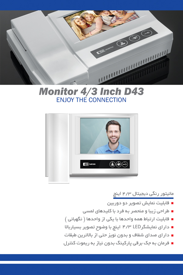 آیفون تصویری تکنما D43 دارای صفحه نمایشگر 4.3 اینچی تمام رنگی میباشد که از فناوری های TFT-LED در تولید آن استفاده میشود که در کاهش مصرف انرژی در این مدل آیفون ها تاثیر گذار است و دلیل آن نازک تر بودن صفحه نمایشگر نسبت به مدلهای پیشین این شرکت است این مانیتور لمسی نبوده و فقط کلید های تنظیمات در پایین مانیتور لمسی میباشد.